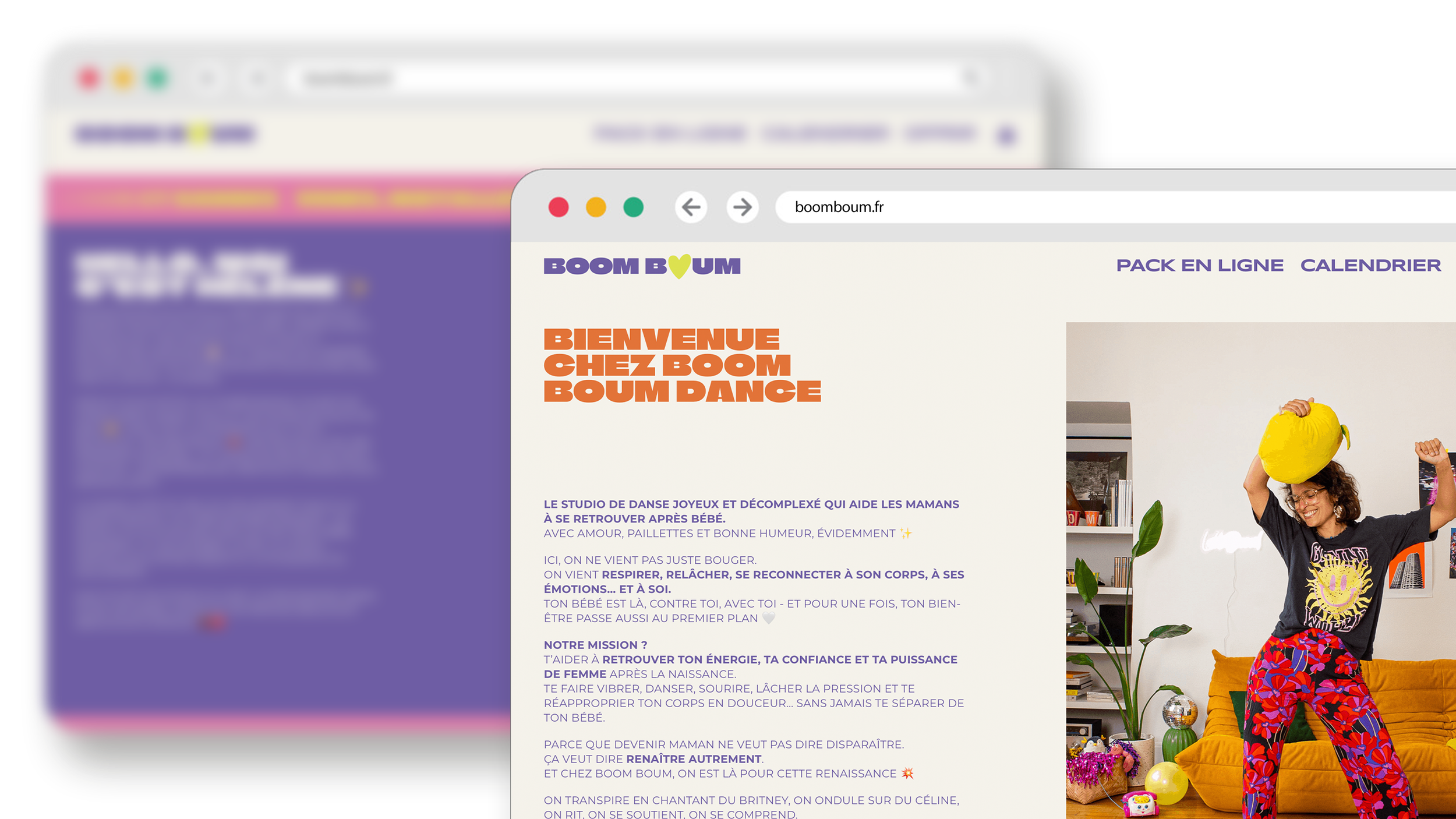 Avec Boom Boum Dance, impossible de faire dans le discret. On a structuré une identité de marque aux couleurs pop, qui pulse autant que leurs chorés. Un branding qui envoie du rythme, des packshots qui claquent, des vidéos pleines d’énergie et un site web qui danse presque tout seul.